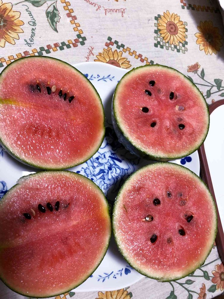 小玉スイカ🍉を切ってみました。収穫予定日7/12〜17 今日は8日なので4日早いけどスイカの付いた蔓の近くのヒゲも枯れて中のタネも黒い🤗冷やして夕食の後で頂きます。😋甘みは売られている小玉スイカ🍉にはかないませんが皮も薄くてシャリシャリ食感😛👍美味しく食べました〜💕
