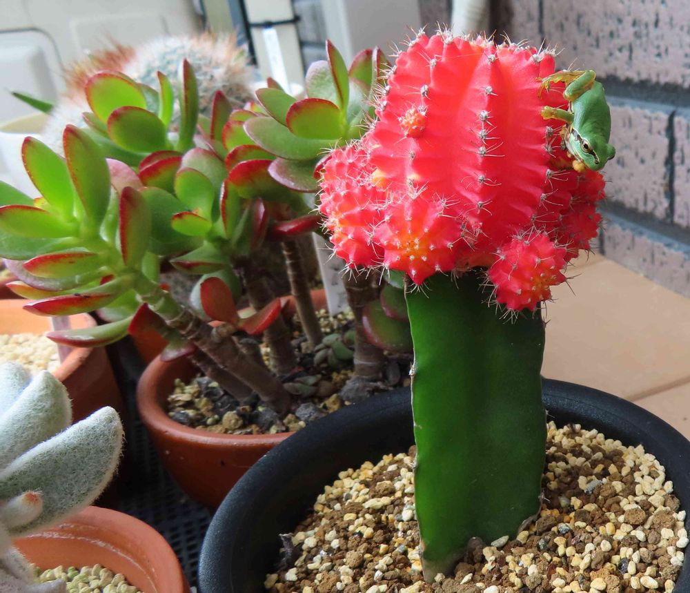 そこ、大丈夫? 何故か不自然な体勢でサボテンに乗っかっているアマガエル。