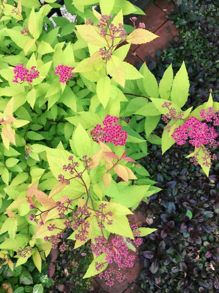 アジュガの濃い葉っぱとシモツケのライムグリーンに可愛い大人ピンク😍最高やないですか✨