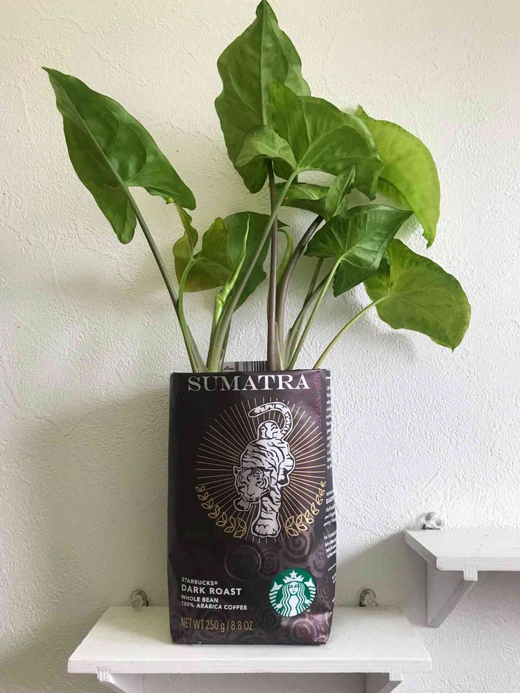 スタバのコーヒー豆の空き袋をただ捨てるのは勿体ないので100均の観葉植物シンゴニウムを2鉢分植えてみた。