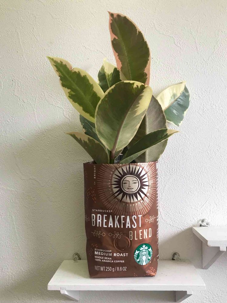 スタバのコーヒー豆の空き袋をただ捨てるの勿体ないので100均の観葉植物ゴムの木を2鉢分植えてみた。