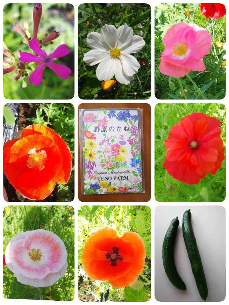 今朝はコマチソウ(ムシトリナデシコ)と、コスモスが咲きました🌼あと、見えづらいけど八重のポピーも咲きました✨ついでに、今朝の収穫🥒😄