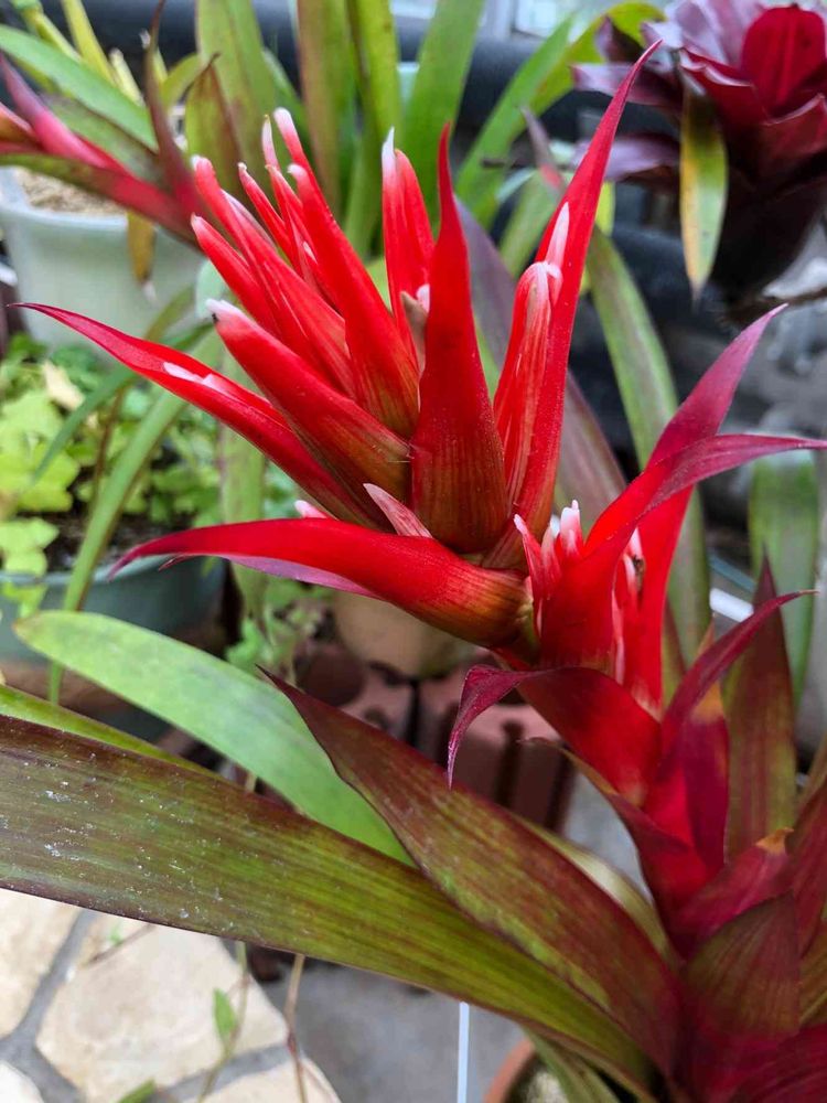 珍しい植物を発見。「ネオレゲリア」です。ブラジルを始めとする熱帯地域に自生するパイナップル科の植物。赤い尖った葉っぱがいかにも情熱的に見えますが、株の中央に花芽が姿を現し、紫色の小さくて可愛い花が咲くそうです。見てみたいなぁ。