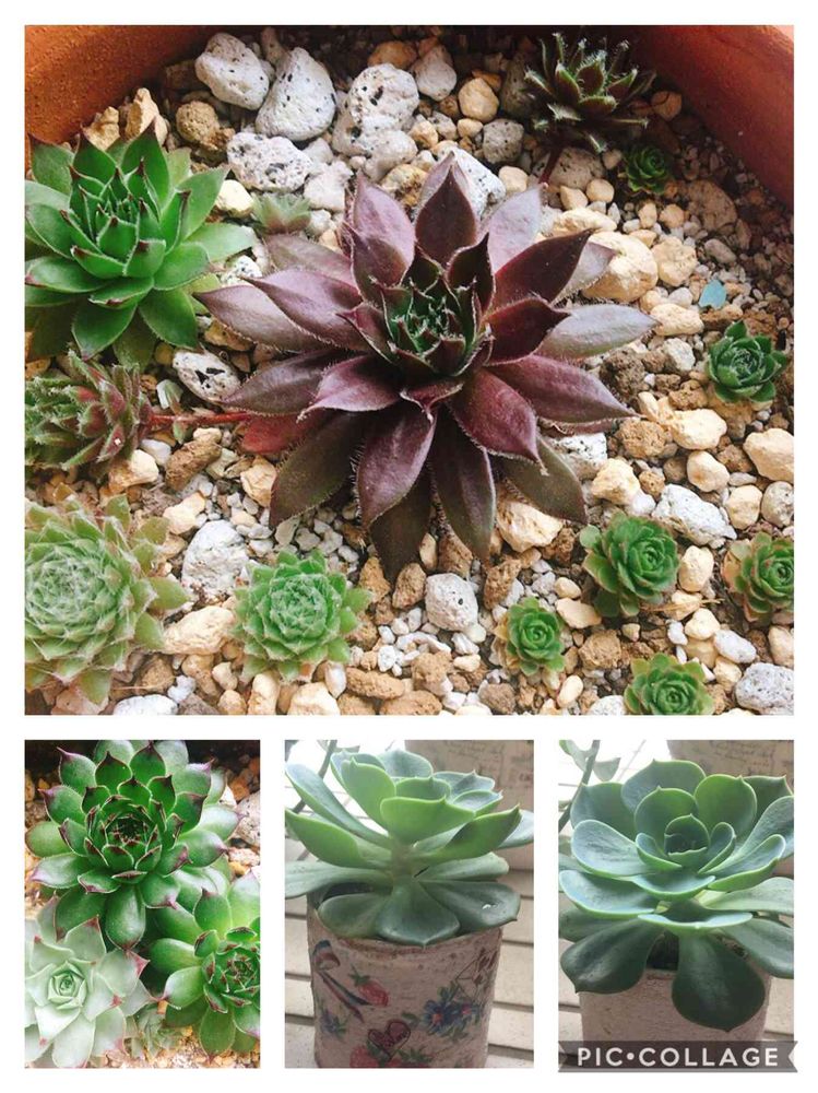ワイン色の子を土に着地させたくて、大きめの鉢に植え替え、まわりの小さな子達は切り離して植えた子達だよ〜❣どちらも今のとこ元気✨