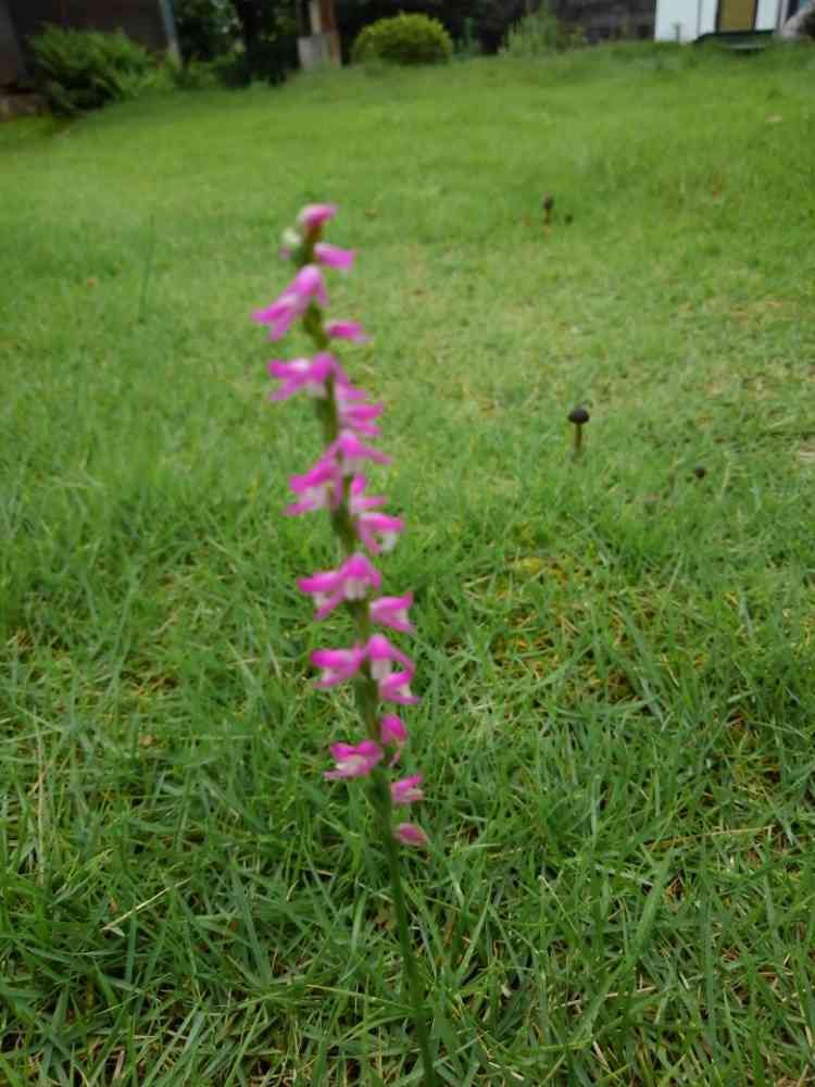 ねじりばな、ですよね。きっと。ポツポツ咲いてます。そして向こうには名前のわからないキノコ。見渡すとけっこう顔のぞかせています。このじめじめで、出てきたんですね。
