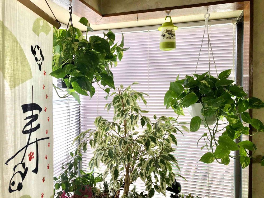 ワンコインで買ったポトス(左)が、みるみる成長して、今では右側ポトス(子)の方が勢いが止まらない😄ベンジャミンもボサボサだったのでカナリ切り詰めました。