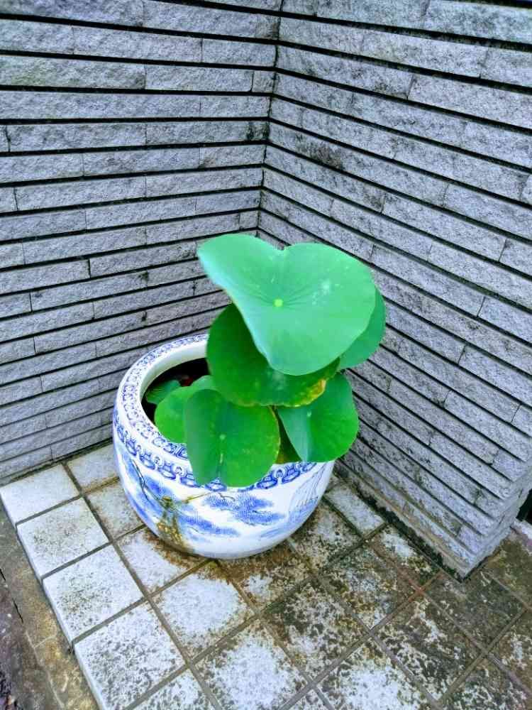 仕事帰りに、通り道のお宅の門の前に、火鉢に蓮が栽培中…水栽培かしら⁉️