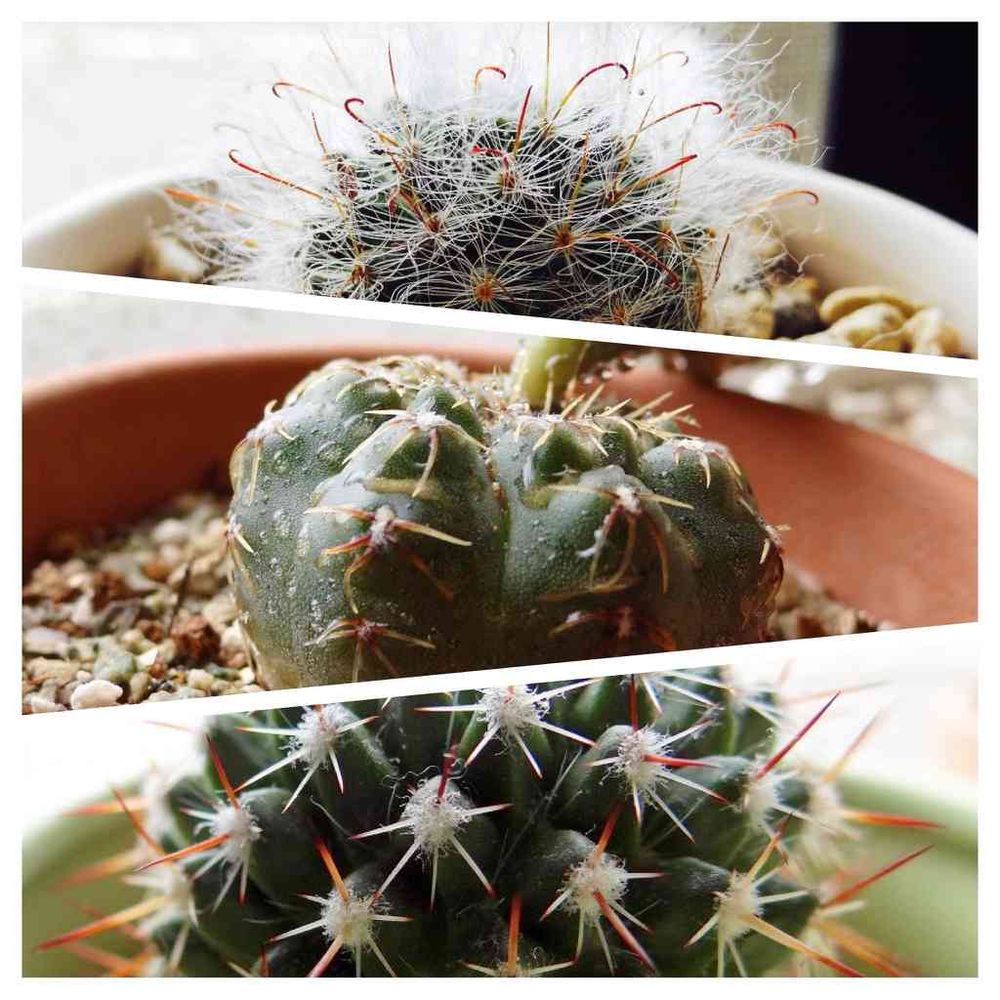マミラリア属の赤い棘が好き。中央のギムノカリキウム属、4日前に撮影した時より斜めに…というか萎んでる⁈花に栄養摂られていったか。あわわわ