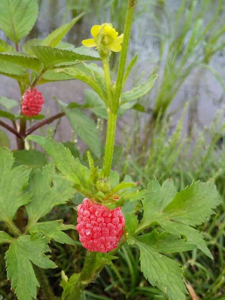この 中央の 赤いのが ヘビイチゴじゃなく タニシの卵なの😱