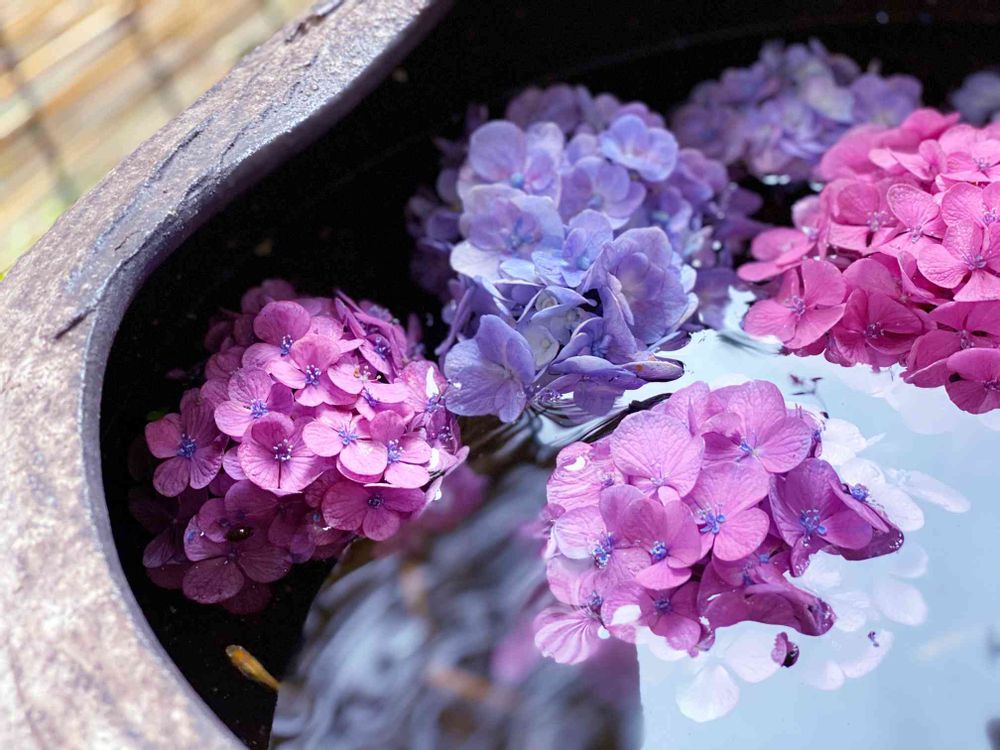 今朝はメダカ鉢に紫陽花を浮かべてみました♪