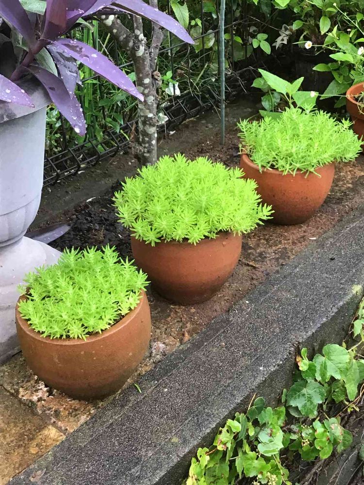 植えて 活躍させてあげないと...と、、簡単に 出来る 園芸を やってみました❗️ とにかく、同じ鉢を 、同じ植物を 植えて、等間隔に 並べると リズムが 出ますね❣️ メキシコマンネングサは 増えるし、丈夫だし、色も