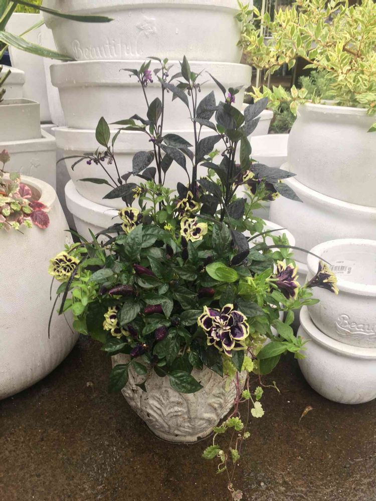 黒づくしで作ってみました。暴れたペチュニアの寄せ植えは難しいです。