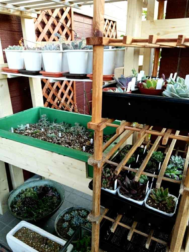 元はと言えば恋い焦がれた子持ち蓮華にホームセンターでやっと出会えて勢いで3ポット買った事が始まりでした。プランターに植えようかな?鉢を買おうかな?でもランナー結構長そうじゃない?と想いを巡らせたどり着いた答えがメダカを飼育していたトロフネでした。おお!我ながらグッドアイデア!と思ったけど土入りのトロフネを支える台はなく、作る事に。トロフネ乗っかって喜んでたら、あれ?エケベリアのスペース足りなくない?全部乗らないよね?しかも買った箱のまま並べてないセンペルもあるよね?な感じになり、急遽家にあった木製ラックを連結して即席の棚にしました。棚板増えたからもっと置けるー(*´ェ`*)と、嬉しい誤算。子持ち蓮華に出会ってしまい、200円の安さに3ポットも買ってしまい、浪費ループから抜けられなくなった人間です。