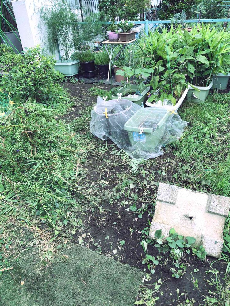 きゅうり と スイカ🍉のプランターの無くなった庭の草むしりをしましたよー。゚(゚´Д`゚)゚。つかの間の曇り空に作業を少しずつ🌿🌱🍃🍀☘️🌱🌿🌸🌼🌸🎋進めなければ......