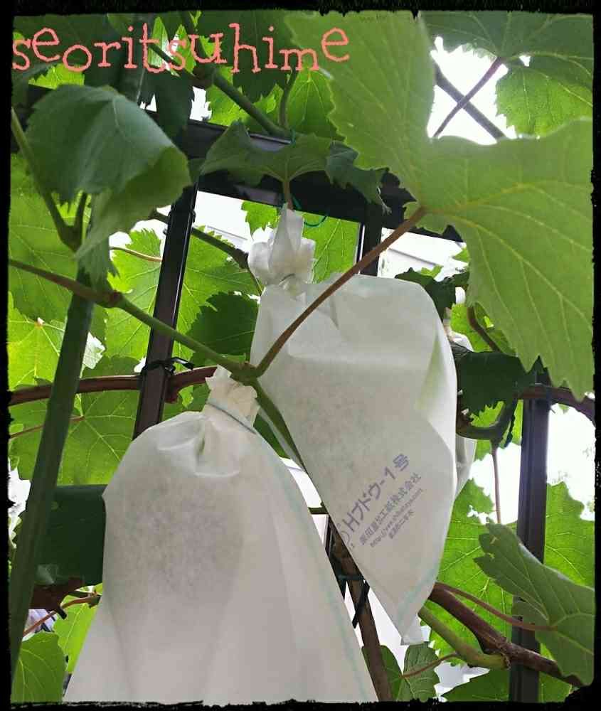 ①まだ粒が小さい房以外全てに傘掛けをしました。(写真はネオマスカット)