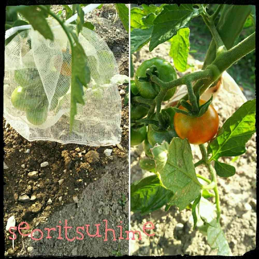 中玉トマトが色付いてきました( ´罒`*)✧ トマトを鳥さんや虫さんから守るため、小さな球根ストック用の網でトマトの花房をまるっと入れてます。