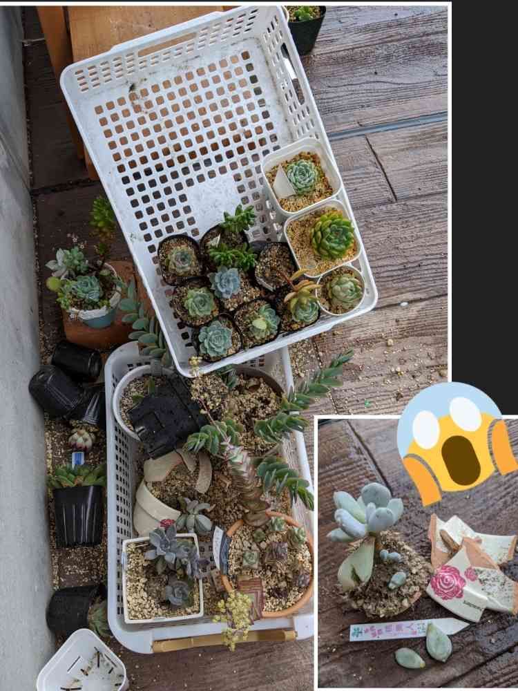 しっかり棚に置いてたのにカゴごと落下。下にある鉢やかごの中の鉢たちがバラバラになってた😭