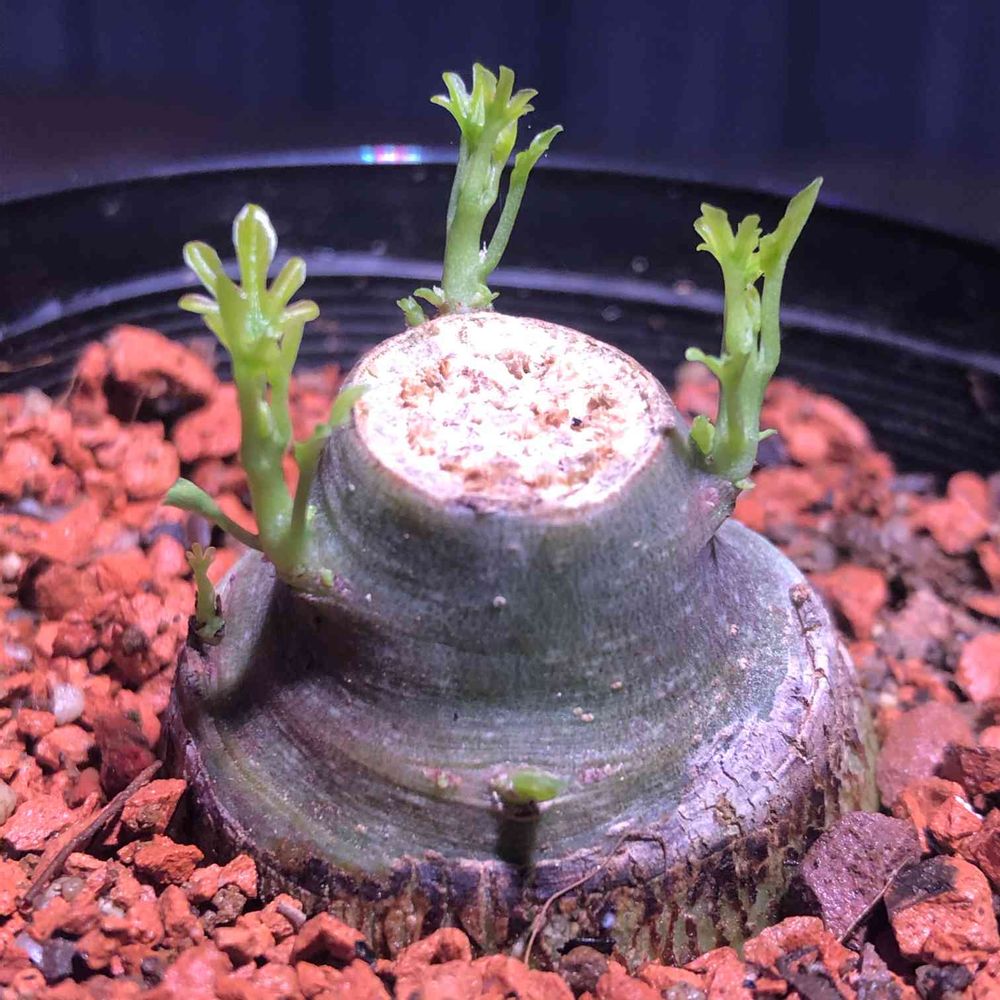 強剪定から10日経過したアデニア・グラウカ。長雨のため現在室内でLED照射中。新芽が3箇所と思っていたら根元からも2箇所出ていて全部で5箇所だった。ちっちゃい芽は摘んだ方がいいのだろうか?でも怖くてできない。