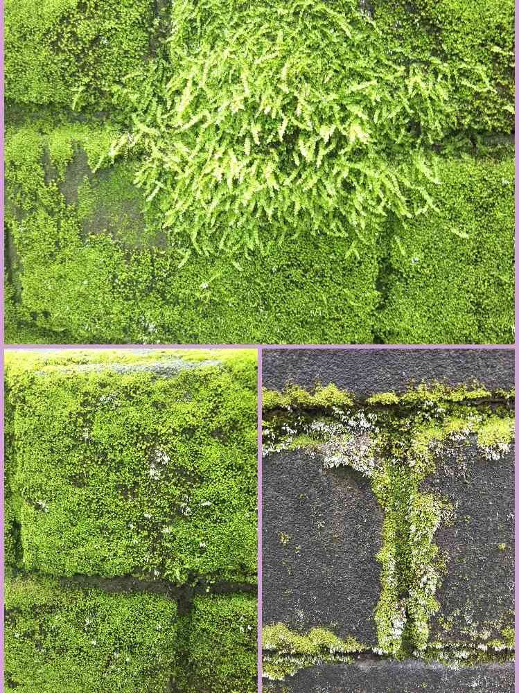 歩道脇のブロック塀に、雨で鮮やかな緑色を見せてくれる「苔」たち。