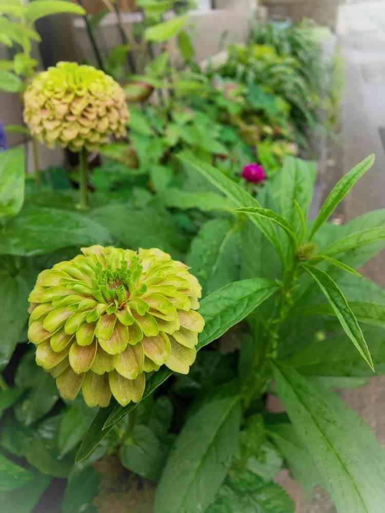 ジニアが新しく咲いてきたよ🎵クイーンレッドライムとライムグリーンのと育てたことあるけどこの子は2つの中間のカラーと調べた時に知りましたがまさにその通りの色ですね‼️