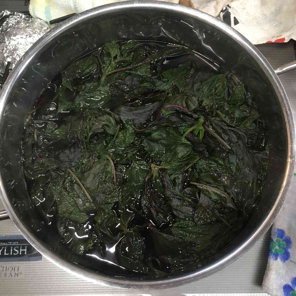赤紫蘇ジュース作り2。3Lのお湯に300gの赤紫蘇入れ、赤紫蘇が緑色になるまで湯がきます。
