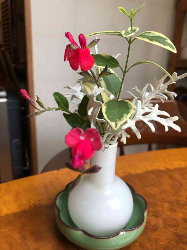 庭のチェリーセージを小さな花瓶に挿してみました。細い枝が折れやすくお花もすぐに散りますが、かわいいお花ですね💕