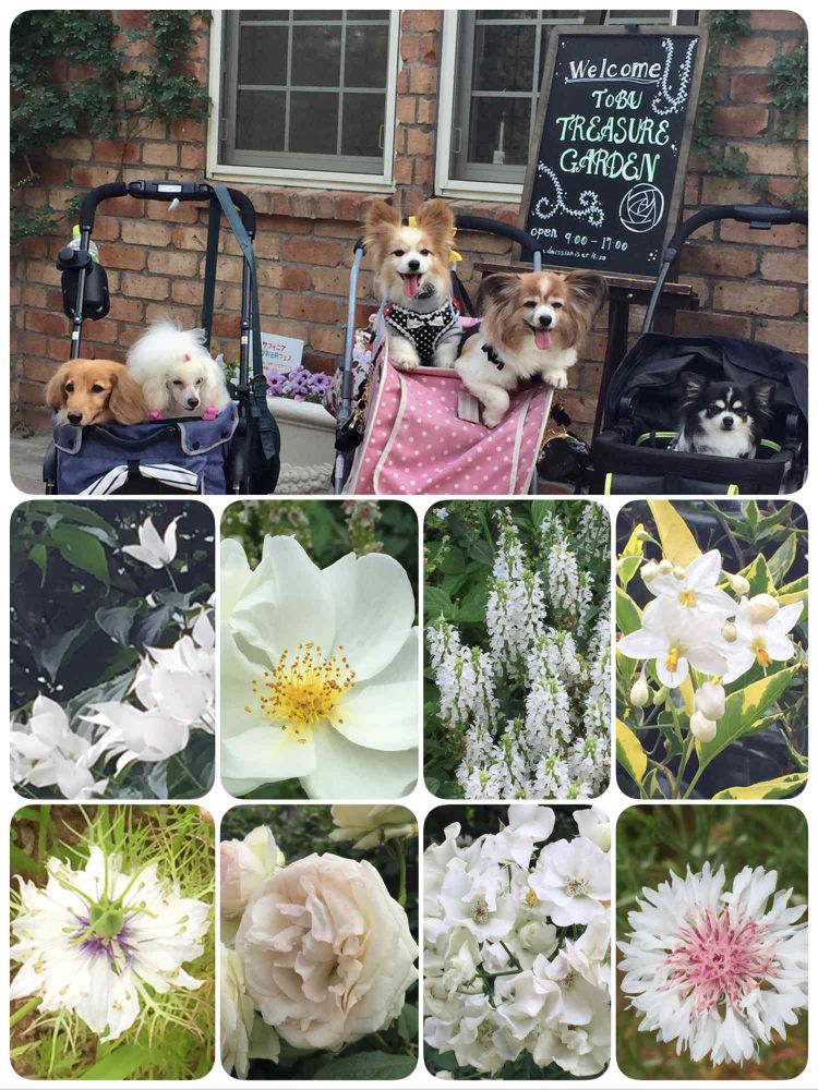 最終章は白いお花を集めました。特に上段左端のヤマボウシは空に向かって、それは綺麗✨に楚々として咲いていたのが印象的でした。出口で本日のお供だった🐶たちと集合写真撮りました😄ミニピン君もいたけど早退しちゃったのが残念でした。