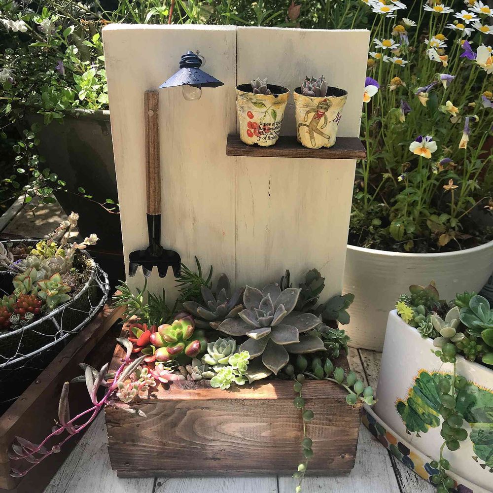 初めまして😊可愛いDIYの鉢や椅子に、多肉の寄せ植え😍どれも、好きです✨参考にさせて下さいね。