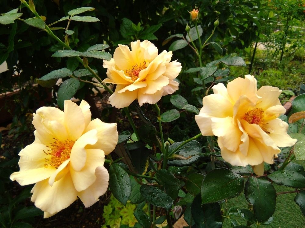バラの二番花が梅雨時期にかぶり、