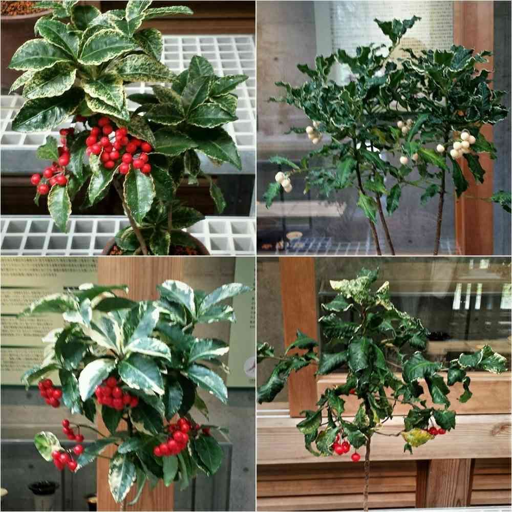 万両の左上、立実伊達という品種ですが実が下向きではなく立っているんですね😅