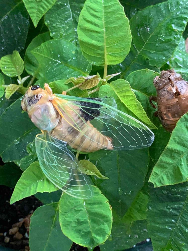 ☔️降る中、クマゼミが5分前に生まれたばかり。まだ、体が乳白色で柔らかいです☺️