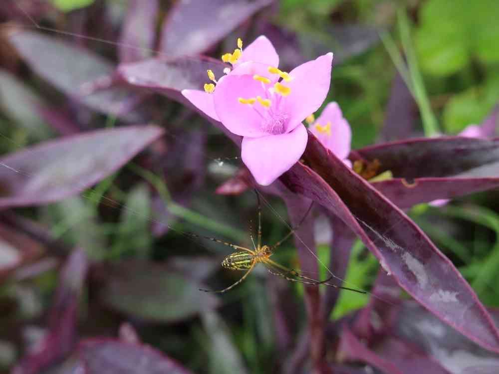 ムラサキゴテンのそばに、カラフルな蜘蛛が・・・