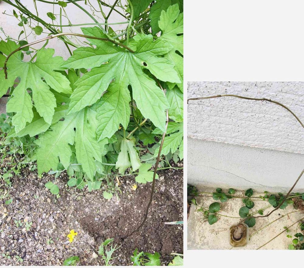 むかごを育ててみたくて長芋を切って水を入れたペットボトルに入れてみたら蔓がのびてきたので(写真右)ゴーヤの前があいていたので植えてみました(写真左)