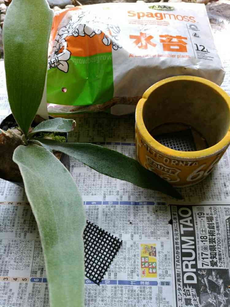 お天気回復したのでビカクシダの苗を仮の鉢に植えつけることにした。