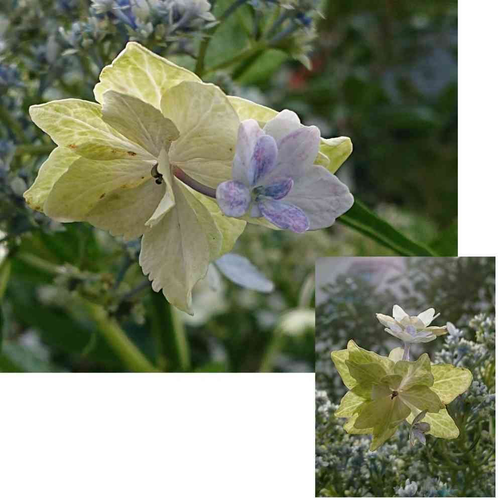 ガクアジサイの、もうお婆ちゃんですが、額咲きの中から小さな萼が出てきているのが見えます。庭で10年も毎年咲いてくれますが、こんな状況は初めて❗。