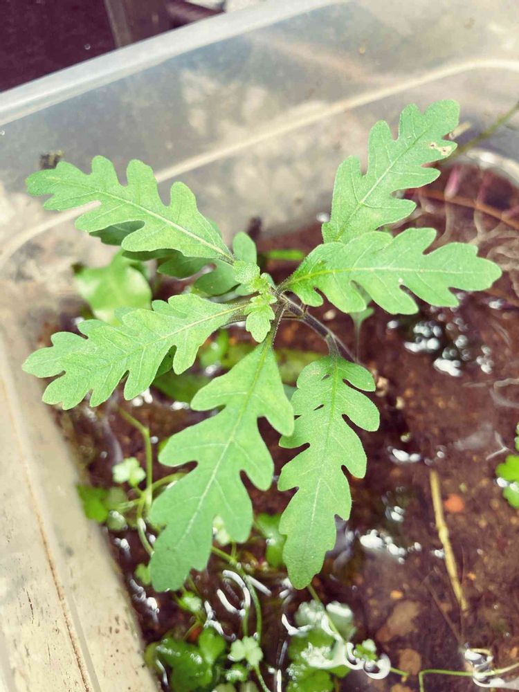 ハイグロフィラ ピンナティフィダという水草を水上化出来るかお試ししていて、上手いこと水上葉が育ったものの写真です。