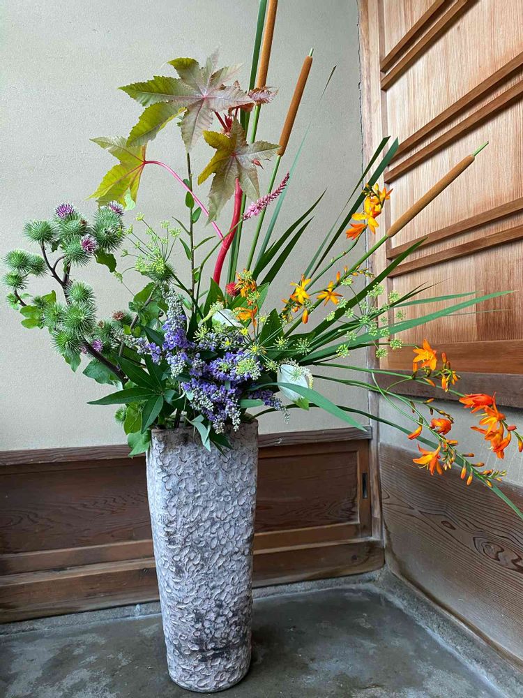 おお!ガマだー季節感あるなぁ、右のオレンジの子は、檜扇水仙というのかしら…どちらも爽やかな形に入れられていて、なんだか夏らしい💓と興奮して拝見していましたが、他の花材のお名前は一致しませんでした(´•̥ ̯ •̥`)