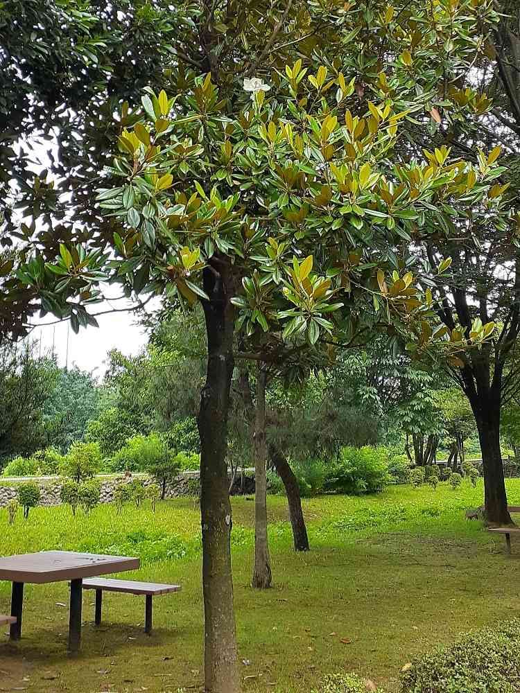 この木自体は5、6m位あり見えにくいですが写真の上に白いお花が咲いています。高さにすれば3m位の位置なのでお花を撮れず残念ですが直径15cmはある大きなお花です🎵