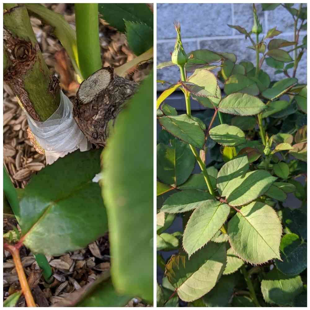 シュートや枯れ枝の処理をしていた時に間違えて花枝が沢山ついてる枝先の根本に✂を入れてしまい3分の2幹を切断してしまいました😱何をやってるの私🤯慌てて枝を支え、完全に切れてないのを確認して速攻メネデールテープグルグル、支柱を立てる。水をやる。これでもしかしたらくっついて生きるかも😥現在ご覧のように蕾も葉っぱも生き生き😅大丈夫かな😅