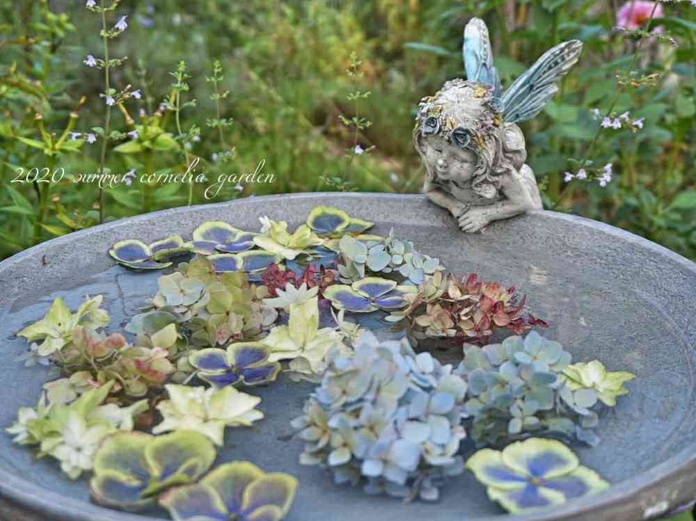 アンティークカラーの紫陽花をバードバスに浮かべて、妖精さんと一緒に楽しみました*・゜゚・*:.。..。.・*:.。. .。.:*・゜゚・*