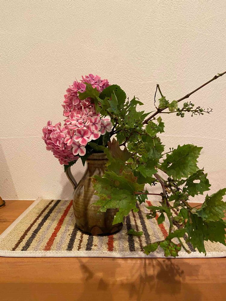 紫陽花切っていて山葡萄の枝まで切ってしまったので、まだ綺麗に咲いている紫陽花と最後の花道と飾ってあげました。