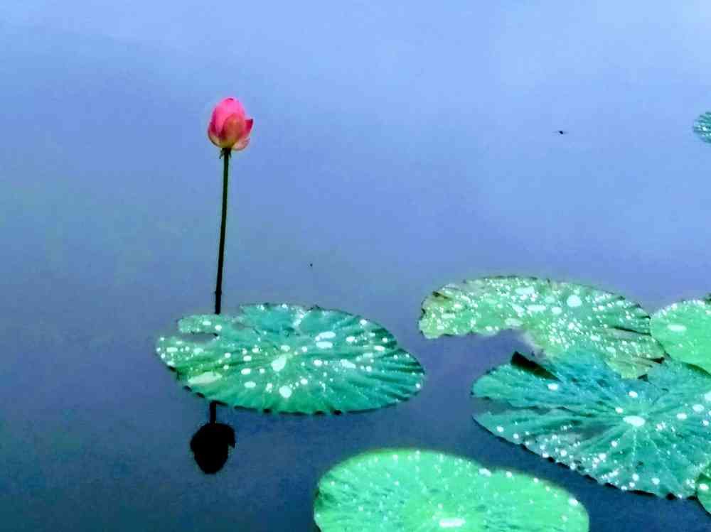 今朝は雨☔、蓮の葉にも、雨の粒…。