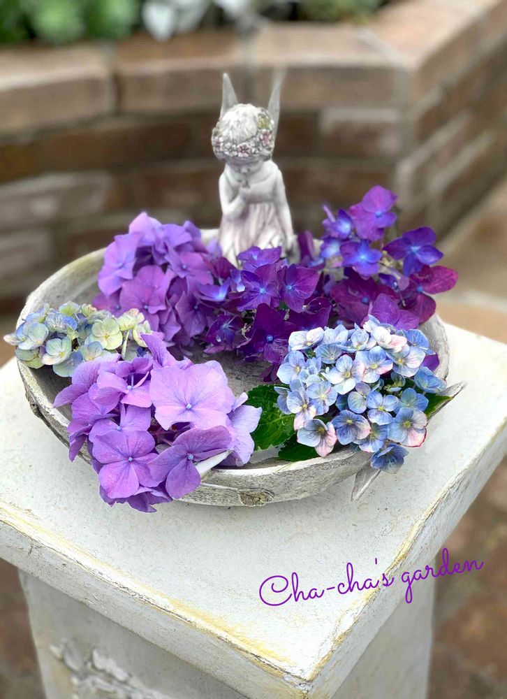 バードバスに青系の紫陽花浮かべて(゜∋゜)💙💜