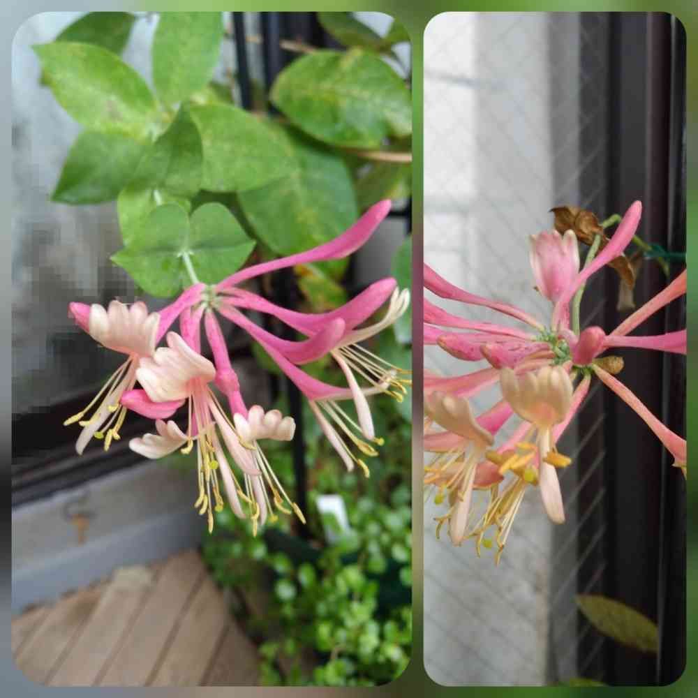 ロニセラ ハニーサックル ゴールドフレームが初めて咲きました💞 葉がハダニにやられてボロボロですが、綺麗に咲いてくれましたヽ(*´∀`)ノ♪