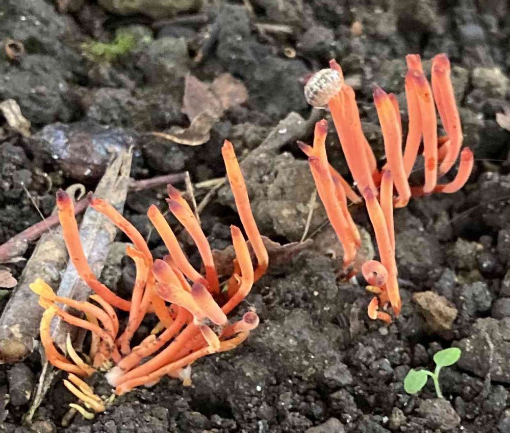 近所のキノコ:シロソウメンタケに似ているけど赤いなぁ.時間が経つと色付くのかな?と思ったのですが、調べたら仲間の「ベニナギナタタケ」でした。