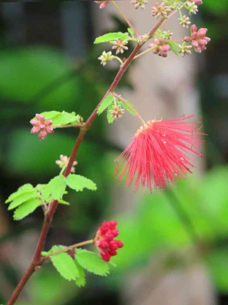 ヒネム(緋合歓)(別名: 紅合歓)はマメ科ベニゴウカン属の熱帯性常緑低木で、ネムノキ(マメ科ネムノキ属)とは別属の植物。高さ1~1.5mになる。赤い化粧パフのような半球形の花を咲かせるが、これは雄蕊の集合体で、長さは2.5cmほど。花は夜に開き、翌日の午後にしおれる。開花時期は5~10月と長い。ピンクのネムノキ(合歓の木)を赤くしたような花を咲かせ、葉はネムノキに似て夜閉じる。ネムノキに似た赤い花から紅(緋)合歓(ヒネム)と呼ばれ、そのまま読みやすい「ベニゴウカン」になったと思われる。
