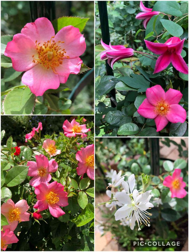 ピンク色のバラとクレマチス 白いガウラが華やかで元気が出ますネ💕