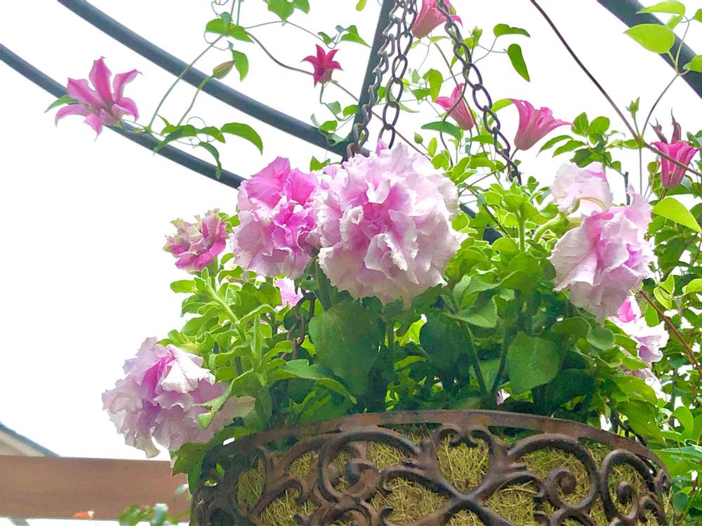 八重咲きペチュニア,クレマチス ダッチェス・オブ・アルバニー,バラのアーチの投稿画像