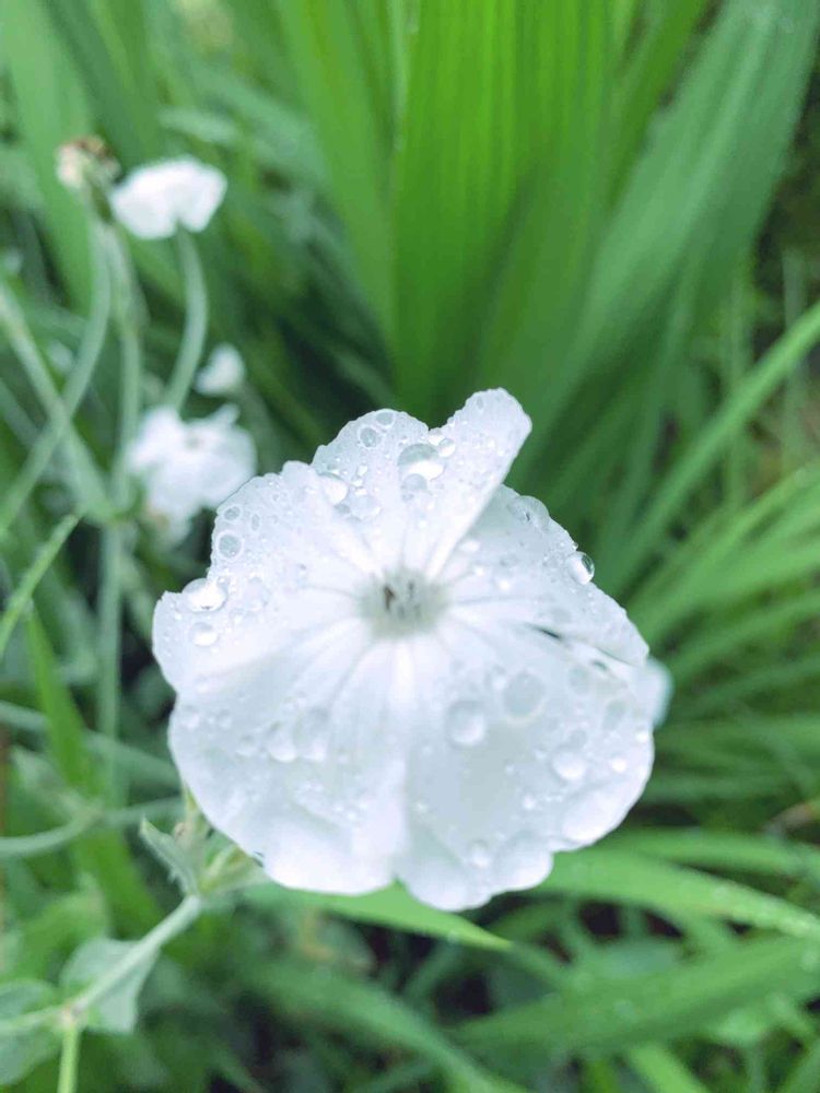 雨の滴を乗せて限りなく美しい白色のスイセンノウ🤍🍃