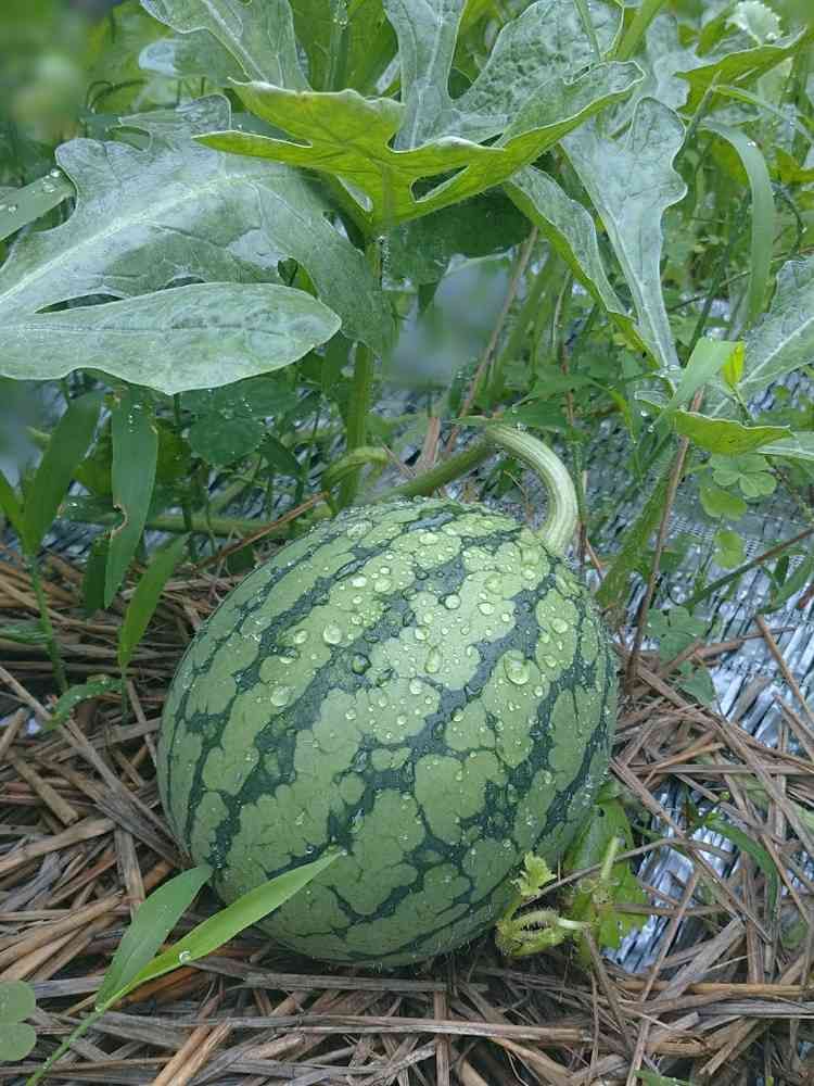突然割れてしまったり、収穫時になるとカラスにやられる可能性ありますからね。確か小玉スイカの場合は玉が大きくなり始めてから約1ヶ月くらいだったと思います。細かく言うと一日の平均気温だったか、それを計算して収穫するそうです。私はそんな事やっていられないから髭が枯れたりとかスイカを叩いて勘で収穫しますよ😅収穫が近くなったらカラスの苦手な糸をスイカの周りにぐるぐる巻きにしようと思っています😊✌️